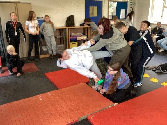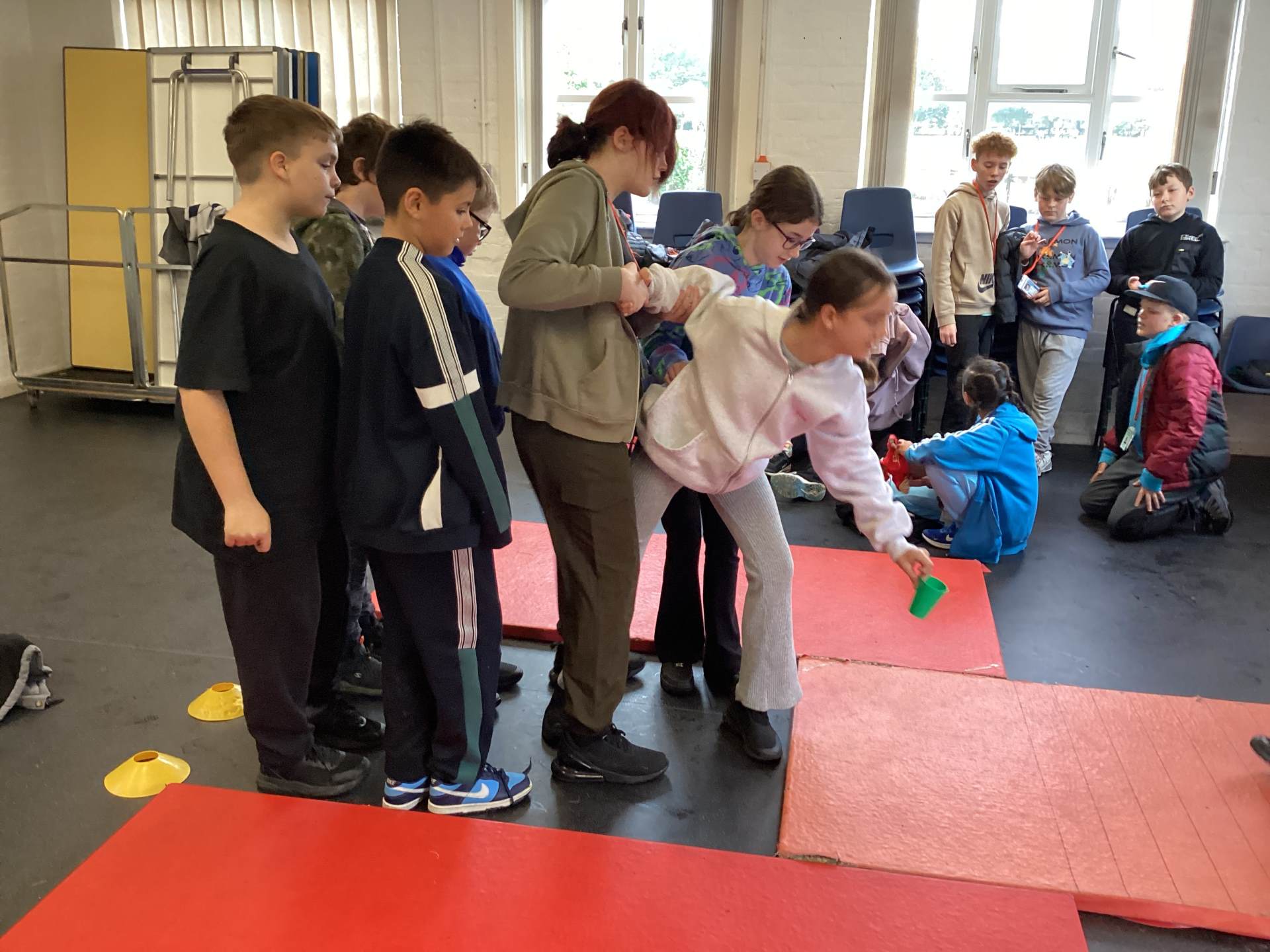 Activities included Conflict, a tricky tyre game where pupils had to cross without falling off; the Assault Course, where teams raced each other but had to start again if anyone fell; Building a Construction, which tested teamwork and problem-solving as pupils built a structure strong enough to hold four members of their form; and Cups, where pupils became “human cranes” to pick up and place cups with precision and coordination.