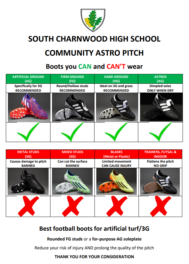Please click here to see a poster showing what footwear can and cannot be used for PE lessons on the 3G pitch. This applies to PE uniform for all years.
